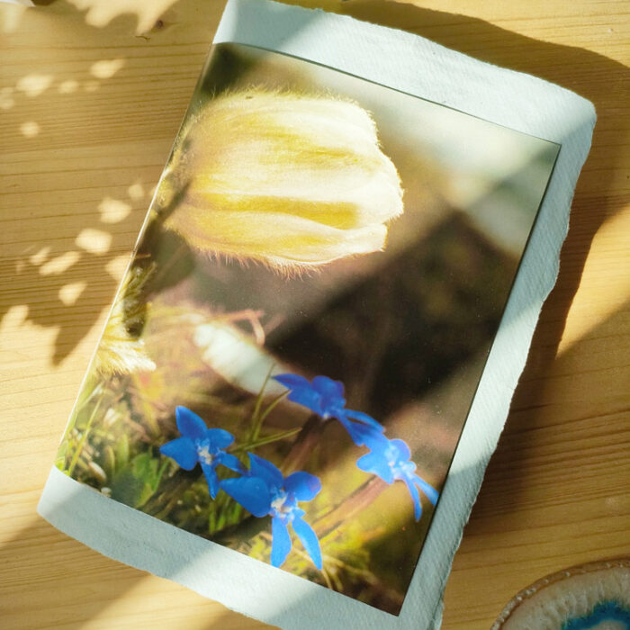 con carta fatta a mano riciclata, cartoncini, immagini botaniche, fiori secchi naturali e carte di recupero